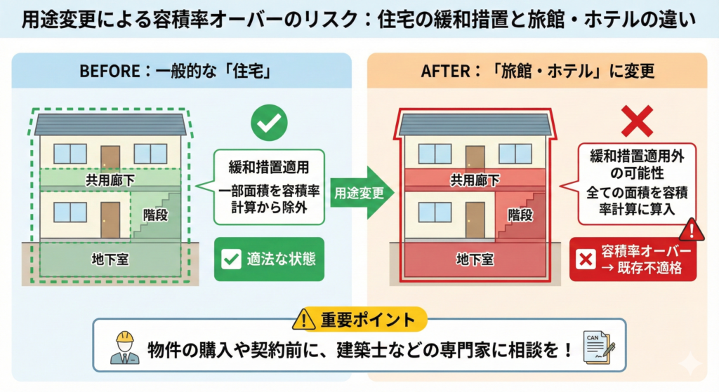 実は、一般的な「住宅」には、共用廊下や階段、地下室などの面積を容積率の計算から一部除外できる緩和措置が適用されている場合があります。しかし、建物の用途を「旅館・ホテル」に変更すると、この緩和措置が適用されなくなる可能性があります。
