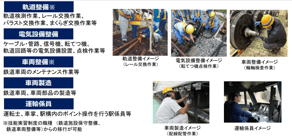 | 5. 運輸係員 | ポイント操作、駅設備管理・取扱業務、旅客案内、車掌業務、運転士業務等 | (試験合格必須・実習免除なし) |
